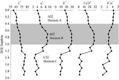 2.3 色度特征CIELAB表色系统被广泛用于土壤研究[18,27-29]。ZN剖面色度参数的深度变化曲线如图 5所示。剖面整体L*随深度增加而增大,主要指示有机质含量。a*、b*与Ca*b*具有相同的变化趋势,三者在B层具有最高值,C层具有最低值。b*/a*与L*具有相反的变化趋势,在剖面表层具有高值表明该指标在垂直方向上受水分影响较大。