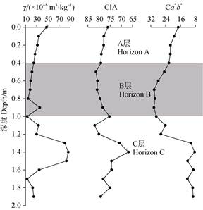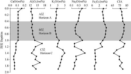 ZN剖面地化参数随深度变化曲线如图 6所示。其中Fe2O3随成土作用的增强而增加,表明在成土过程中,其他元素相对淋溶而铁元素相对富集。CIA是由CaO、Al2O3、K2O、Na2O等四种氧化物计算得出,数值介于85~100指示湿热气候条件下经历较强风化,65~85指示经历中等程度风化。该剖面CIA与Fe2O3的变化趋势基本一致,其均值低于热带亚热带低海拔地区湿热气候条件下的CIA值[21],表明在较高海拔地区的气候条件下的风化程度较弱。剖面B层CIA值高于A层和C层。A层位于土壤顶部,理应风化程度最高并获得最高的CIA值,然而实际情况并非如此。对此可能的解释是A层在风化过程形成的细粒物质(如黏土矿物)向下迁移,并在B层淀积。