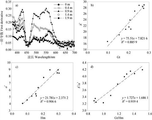 漫反射光谱是衡量针铁矿(Gt)、赤铁矿(Hm)相对含量的有效方法。通常在漫反射光谱的一阶导数图谱中,代表针铁矿含量的特征峰峰值在435 nm左右,代表赤铁矿含量的特征峰峰值在565 nm左右[29]。图 7为ZN剖面代表性样品的漫反射光谱和土壤层(A层和B层)色度参数与漫反射光谱参数的相关关系。由图 7a可以看出,除了0.9 m处样品外,其余样品的435 nm处峰高均大于565 nm处峰高。图 7b~图 7d则显示剖面上部土壤层(A层和B层)中Gt(435 nm处峰高)与b*、Hm(565 nm处峰高)与a*、Gt/Hm(435 nm与565 nm处峰高之比)与b*/a*具有良好的相关性(R2分别为0.885 9,0.906 6,0.919 4),表明ZN剖面的色度参数与漫反射光谱一致,可以良好地反映剖面中针、赤铁矿的相对含量。