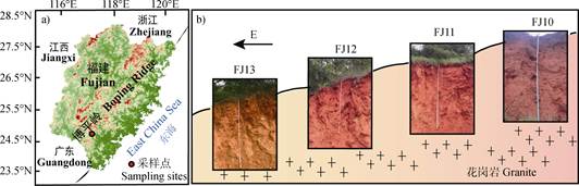 1 材料与方法 1.1 研究区概况与样品采集研究区为我国东南丘陵地区的闽中大山带,母岩为富含石英和钾长石的燕山期花岗岩[13]。该区为亚热带季风气候,年均气温17~21℃,年降水量约1 400~2 000 mm,位于红壤和黄壤转化的阈值转化区[14],不同地形尺度上广泛可见红壤-黄壤分异现象。