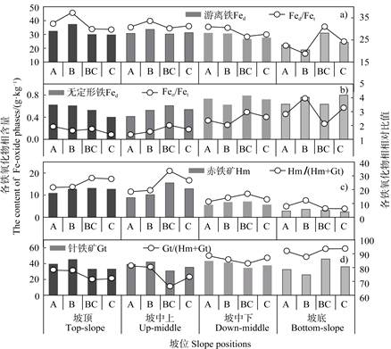 剖面尺度上,上部土层Fed、Fed/Fet普遍较下部高,同样与上部土层相对强的化学风化作用有关。同时,由于淋溶迁移也使得上部土层Feo整体低于下部土层[26]。此外,多数坡位上部土层(A、B层)Hm和Hm/(Hm+Gt)小于下部土层,揭示出剖面尺度Hm、Gt的分异现象,这与上部土层频繁地表水干扰和高有机质含量致使Hm溶解,并重新结晶为Gt有关[27-29]。