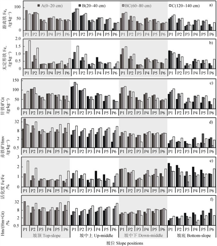 A(0~20 cm),B(20~40 cm),BC(60~80 cm),C(120~140 cm)。注:下同。 Note: The same below. 图 2 坡地土壤全样中铁氧化物相的分配 Fig. 2 Distributions of Fe-oxide phases in bulk soils along the slope |