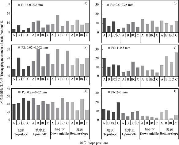图 4 坡地土壤各粒级团聚体分布特征 Fig. 4 Distributions of aggregate fractions along the slope |