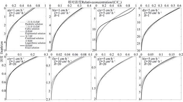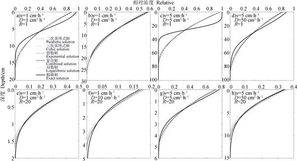 不同参数条件下各边界层解的精度存在差异,在表 2所示情形中,复合解的预测误差总和最小,但最优预测结果多由三次多项式解或指数解取得。利用不同边界层解计算1 h浓度分布时,总体来看三次多项式解得到的结果最佳,且对吸附性溶质的预测精度相对更高;指数解在预测5 h剖面溶质分布时整体上优于其他边界层解,其精度在R=1的情形下高于R=20。由上述对比分析可知,利用边界层方法计算较短时间内的溶质剖面分布时,对于吸附性溶质而言,可选用三次多项式边界层解,而当溶质不被吸附时,则可选用指数解或二次多项式解;而预测较长时间后的溶质浓度时,采用指数解获取的非吸附性溶质浓度分布更接近实际分布,三次多项式解和复合解可用于计算吸附性溶质的分布情况。