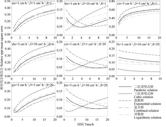 图 3 各边界层解预测浓度剖面的相对均方根误差随时间变化 Fig. 3 Variation of RRMSE of boundary layer solutions with time on predicting solute concentration profiles under different conditions |