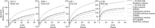 基于CXTFIT拟合获得的参数,分别利用不同边界层解计算下边界层深度并与精确解结果进行比较分析,各边界层解的相对误差如图 4。由图可知,微小通量法对下边界层的估算值均大于实际值,其他边界层解在风沙土、黄绵土和塿土中的估算值初期小于实际值,但随时间推移呈现出逐渐接近而后大于实际值的趋势。其中,三次多项式解对溶质锋深度的计算值显著高于其他边界层解,对数解的计算值最小,其差异主要与函数本身特性有关。进一步对比边界层解用于不同土壤的计算误差发现,边界层解下边界层描述的准确性由高到低依次为:风沙土、黄绵土、塿土、红壤,而边界层解对溶质在黄绵土和风沙土中迁移参数的估算值也最接近精确解。根据土柱实验结果,红壤中溶质迁移的v较大而D较小,溶质以对流迁移为主;黄绵土和风沙土的λ显著高于其他两种土壤,表明溶质的扩散作用相对较强。上述结果表明,边界层解用于描述流速小、扩散强的土壤溶质运移过程时对下边界层的描述更加准确。土壤质地显著影响土壤的孔隙性、持水性和物理机械性质,进而影响溶质在土壤中的迁移过程[21]。通常,质地较细土壤的颗粒具有较强吸附性,运移溶液的流速也较小,边界层解对应的溶质锋深度更加接近精确解,由此估算得到的溶质运移参数也更为准确。