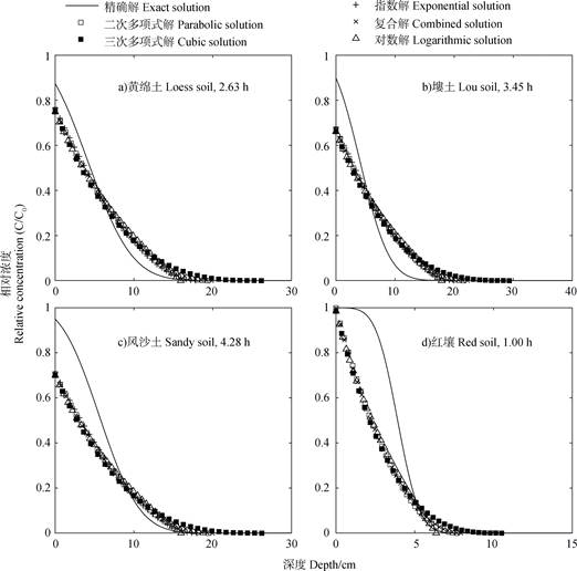 上述结果表明,边界层解可以用于预测溶质在土壤中的迁移过程和动态分布,但在水流流速较快的情形下精度相对较低,此时溶质主要发生对流运移,由此可知边界层解更适用于弥散作用为主要机制的情形,因此应尽量在溶质流速慢、弥散作用或溶质吸附性较强时选用。这主要因为由多项式函数、指数函数、复合函数以及对数函数获得的溶质浓度剖面分布始终呈现浓度变化率随深度增加而不断减小的趋势,而当平均孔隙水流速大、溶质不被土壤颗粒吸附且弥散作用较弱时,溶质浓度变化在初始阶段表现为随深度增加而不断减小,但剖面上层溶质累积迅速,经过较短时间后溶质浓度变化率就出现随深度先增大后减小的现象,边界层方法中假设的浓度分布曲线难以准确描述此时的溶质分布,因此由边界层方法获取的浓度分布与实际情况存在较大差异。此外,由于填装均质土柱弥散度通常较小,因而在水流流速小的情形下使用边界层解更可能得到准确的结果;田间试验条件下边界层解用于较大尺度土体研究的精度相对更高。
