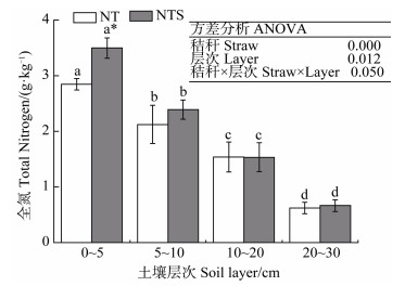 注:不同小写字母表示同处理不同土层之间差异显著,*表示相同土层不同处理之间差异显著。下同。 Note: Different lowercase letters indicate significant differences between the four soil layers at the P < 0.05 level. * indicates differences between the NT and NTS treatments at the same soil layer at the P < 0.05 level. The same below. 图 1 秸秆覆盖下不同土层全氮含量 Fig. 1 Soil total nitrogen contents at four soil layers under two straw managements |