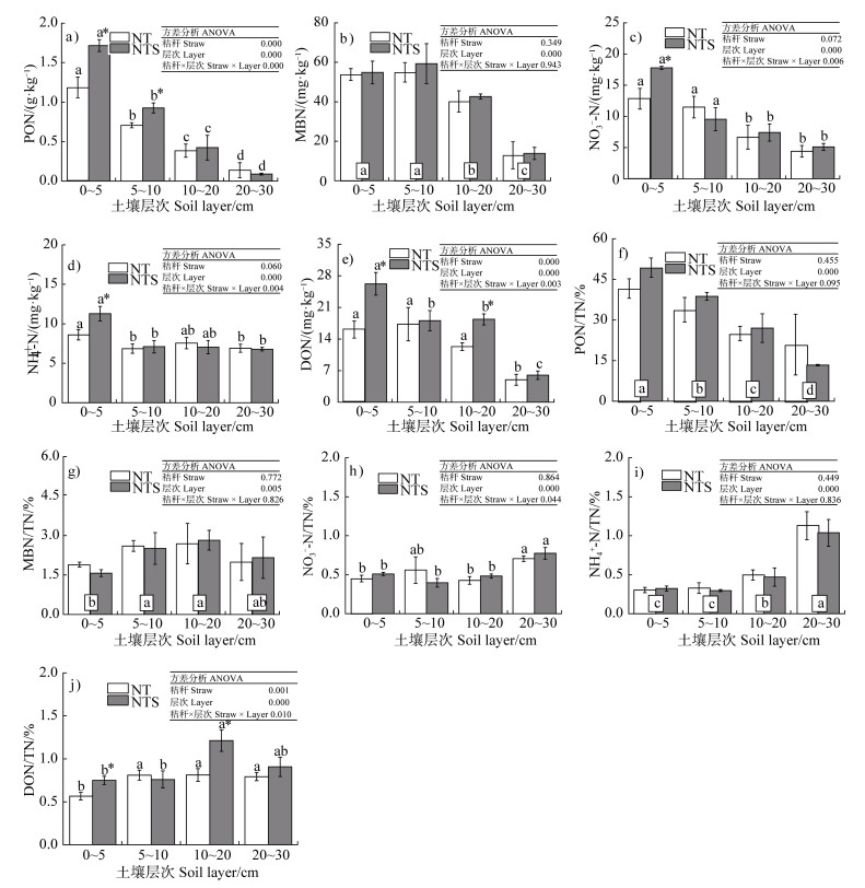 注:PON,颗粒有机氮;MBN,微生物生物量氮;NO3––N,硝态氮;NH4+–N,铵态氮;DON,可溶性有机氮;TN,全氮。带方框的不同小写字母表示基于土层主效应的不同土层之间差异显著。下同。 Note: PON, particulate organic nitrogen; MBN, microbial biomass nitrogen; NO3––N, nitrate-nitrogen; NH4+–N, ammonium-nitrogen; DON, dissolved organic nitrogen; TN, total nitrogen. Different lowercase letters in boxes indicate significant differences between the four soil layers at the P < 0.05 level based on the main effects of soil layer. The same below. 图 2 秸秆覆盖下不同土层颗粒有机氮、微生物量氮、硝态氮、铵态氮和可溶性有机氮含量(a、b、c、d、e)及其在全氮中占比(f、g、h、i、j) Fig. 2 Soil active nitrogen contents and their proportions in soil total nitrogen at four soil layers under two straw managements(a. PON contents; b. MBN contents; c. NO3––N contents; d. NH4+–N contents; e. DON contents; f. PON/TN values; g. MBN/TN; h. NO3––N/TN values; i. NH4+–N/TN values; j. DON/TN) |