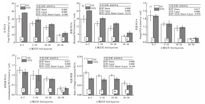 图 3 秸秆覆盖下不同土层总体微生物(a)、细菌(b)、真菌(c)和放线菌(d)的磷脂脂肪酸(PLFA)丰度及真菌/细菌比(e) Fig. 3 The abundances of soil total PLFA(a), bacterial PLFA(b), fungal PLFA(c), and actinobacterial PLFA(d), and the ratio of fungal PLFA to bacterial PLFA(e)at four soil layers under two straw managements |