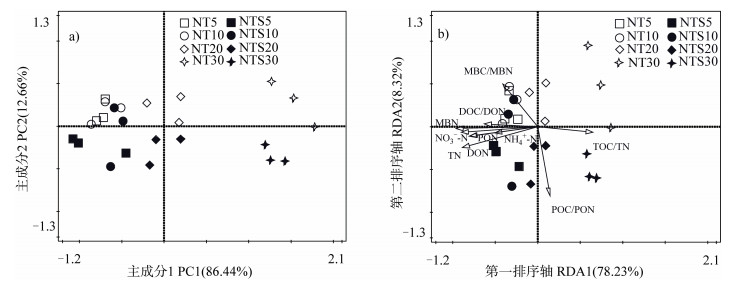 1.4 土壤氮组分及土壤微生物群落组成的测定土壤氮组分测定:土壤TN采用半微量凯氏法,NH4+–N采用靛酚蓝比色法,NO3––N采用紫外分光光度法,MBN采用氯仿熏蒸法,测定方法参考《土壤农业化学分析方法》[18]。DON采用Jones和Willett[19]的方法:将相当于干土质量20 g的新鲜土样加入100 mL蒸馏水,置于摇床(200 r·min–1)震荡1 h,然后用离心机以4 000 r·min–1离心10 min,将上清液通过0.45 μm滤膜,用总有机碳分析仪(Multi N/C 3100,耶拿,德国)测定其含量。PON采用Cambardella和Eillott[20]的方法:向盛有10 g过2 mm筛风干土的离心管中加入30 mL浓度为5 g·L–1的六偏磷酸钠((NaPO3)6)溶液,放置于摇床(150 r·min–1)上震荡16 h后,将全部溶液置于53 μm筛上,用蒸馏水轻轻冲洗至滤液澄清,将筛上的土壤转移至烧杯,于55℃下烘干至恒重,用测定全氮的方法测定其含量。