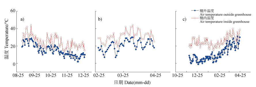 图 3 不同种植季温室内外温度动态(a第一季;b第二季;c第三季) Fig. 3 Temperature dynamics inside and outside the solar greenhouse in different planting seasons (a. First season; b. Second season; c. Third season) |