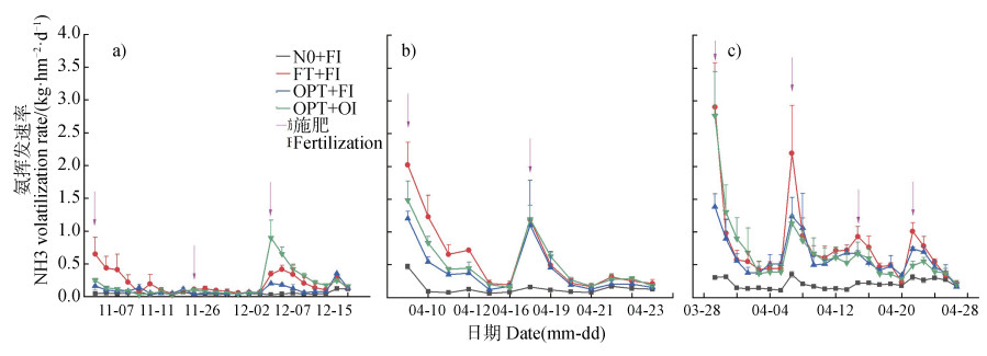 | $ \rm{NH}_{3}排放系数=(施氮处理\rm{NH}_{3}累积排放量-不施氮处理\rm{NH}_{3}累积排放量)/施氮量×100% $ | (3) |