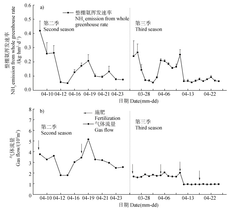 图 5 不同种植季整棚氨挥发速率及气体流量(a整棚氨挥发速率;b气体流量) Fig. 5 Ammonia volatilization rate of the whole greenhouse in different planting seasons(a. NH3 emission rate from whole greenhouse; b. Gas flow) |