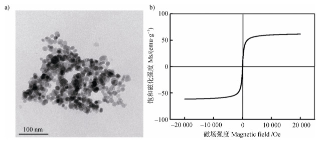 图 1 磁性纳米粒子(MNPs)的透射电镜图(a)和磁滞回线图(b) Fig. 1 Transmission electron microscope image(a)and magnetization curve(b)of the produced magnetic nanoparticles |