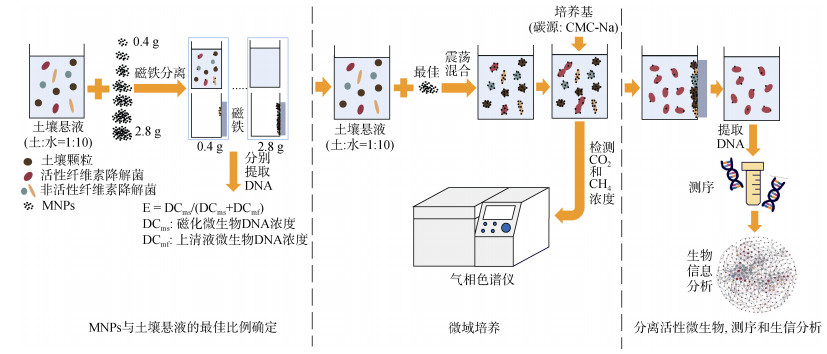 本研究MMI流程详见图 2,主要分为3个环节:(1)确定MNPs与土壤悬液的最佳比例; (2)CMC-Na对磁性纳米材料包裹后的微生物进行微域培养; (3)活性微生物的分离、测序和生物信息分析。
