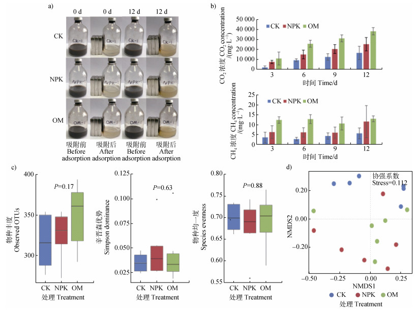 2.2 微域培养及不同施肥处理活性纤维素降解细菌的群落结构用磁铁立即吸附与CMC-Na液体培养基混合的磁性材料包裹的微生物后,培养液澄清透明(图 4a),且DCmf很低,仅在0.11~3.74 ng·μL–1之间。28℃培养12 d后,因微生物大量繁殖,培养液变得浑浊(图 4a)。此时,DCmf上升至81.29±14.96 ng·μL–1(CK)、84.60±36.64 ng·μL–1(NPK)和115.5± 29.35 ng·μL–1(OM)。12 d内血清瓶中的CO2与CH4浓度的变化也反映了培养期间的微生物增殖情况,二者均呈现由CK、NPK至OM增加的趋势(P < 0.05)(图 4b)。测气与确定最佳比例的结果共同说明同质量的土壤中,微生物数量和活性(增殖快)均呈现由OM、NPK、到CK逐渐降低的趋势,即长期施肥增加了土壤中微生物数量和活性。造成该结果的原因可能是长期施肥增加了土壤中的养分含量(表 1),且通过改善土壤理化性质使环境条件更适于微生物生存(如提高总孔隙度和土壤团聚体的稳定性,改善土壤水、气的连通性等),从而增加微生物数量与活性[13-15]。夏文建等[16]也在试验中得出了相同结论。