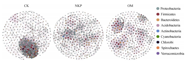 2.4 活性纤维素降解细菌群落分子生态网络分析为明确不同施肥处理对活性纤维素降解细菌种间相互作用的影响,计算了CK、NPK和OM处理下微生物分子生态网络及各拓扑结构参数(图 5和表 4)。结果显示,三种施肥处理下模块化指数均大于0.4,表明三者群落均有模块化结构,即存在生态功能模块。相比于CK,施肥处理(NPK和OM)下活性纤维素降解细菌群落的模块化指数、节点数、连接度、平均聚类系数和更高,而平均度更低,即施肥处理下有更多的微生物群落生态功能模块参与CMC-Na的降解。此外,施肥处理下微生物间的网络连接可能更复杂且网络稳定性更高; 而CK处理下所有节点间的距离均较低且连通性较高[26-29],即施肥提高了CMC-Na活性降解微生物的生态位,增加了网络的稳定性且降低了种间依赖性。