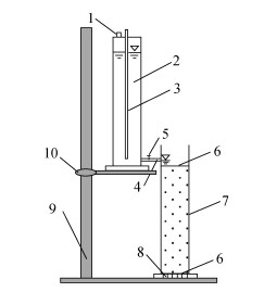 注:1. 橡胶塞 2. 马氏瓶 3. 进气管 4. 供水管;5.止水夹 6. 滤纸 7. 土柱 8.透气孔 9. 固定支架 10. 调节器。 Note:1. Rubber stopper, 2. Markov bottle, 3. Air inlet pipe, 4. Water supply pipe, 5. Water stop clip, 6. Filter paper, 7. Soil column, 8. Air hole, 9. Fixed bracket, 10. Regulator. 图 1 试验装置示意图 Fig. 1 Schematic diagram of the test device |