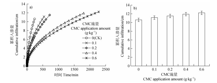 2 结果与讨论 2.1 CMC施量对累积入渗量的影响图 2为CMC施量对入渗过程的影响。由图 2a可以看出,入渗初期累积入渗量的差距不大,入渗时间超过90min之后,CMC对累积入渗量的影响开始显著,这主要是因为入渗初期土壤比较干燥,土壤基质势起到主导作用,而CMC需要一定时间与水分子进行融合才能发挥效果,因此累积入渗量差异不大[22-23]。随着入渗时间的增加(90 min后),土壤表层湿度增加,CMC与表层土壤进行充分作用,其凝聚性能充分显现,使得不同CMC施量处理土壤累积入渗量逐渐拉开差距[11]。观察发现,施加CMC土壤的累积入渗量增加速度明显低于对照处理,在相同入渗时间,施加CMC土壤的累积入渗量更低。入渗240 min时,CMC施量0.1、0.2、0.4及0.6 g∙kg–1的累积入渗量相比对照,分别降低了30.07%,37.37%,58.98%及62.63%,这与吴军虎等[11]的试验结果一致。这主要是因为CMC分子含有亲水性的羧基和羟基,具备良好的吸水能力,能够与土壤中的水分子融合形成水凝胶,从而增加水的黏度,降低了土壤水分的入渗速率[10]。这说明对于施加CMC土壤短时间内难以入渗较多水分,CMC的施用应该配合少量多次的灌溉方式。图 2b为到达预设深度(30 cm)的最终累积入渗量。由图可知,当达到预设深度时,CMC施量0.1、0.2、0.4及0.6 g∙kg–1的累积入渗量相比对照,分别增加了4.90%,8.48%,12.35%及15.17%,这主要是因为CMC改善了土壤孔隙结构,增加了土壤小孔隙数量,进而提高各层土壤的持水能力,增加了土壤累积入渗量[24]。这说明施加CMC能够使更多水分进入土壤小孔隙,这对于土壤盐分的充分淋洗非常有利。