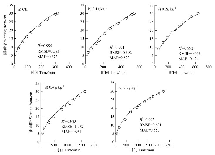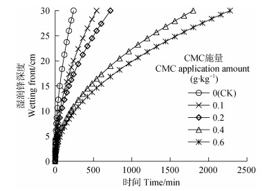 图 3 CMC施量对湿润锋推进过程的影响 Fig. 3 Effect of CMC application amount on the changing process of wetting front |