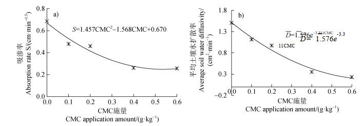 图 4 CMC施量对吸渗率和土壤扩散率的影响 Fig. 4 Effect of CMC application amount on the adsorptivity and the diffusivity |