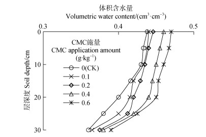 为了分析CMC对土壤水分分布的影响,将不同CMC施量对土壤剖面水分的分布情况绘于图 5。由图 5可以看出,CMC能够有效提高土壤剖面含水量,施加0.1、0.2、0.4和0.6 g∙kg–1 CMC土壤剖面平均含水量相比对照,分别增加了0.72%、1.45%、2.70%和3.74%。这与Ning等[7]施加CMC土壤水分分布规律一致。这主要是因为CMC和水分子形成的水凝胶,增加了水的黏度和水稳性团聚体数量,提高了土壤的持水能力,增加了持水量[15,17],这说明施加CMC能够有效改善土壤结构,增强土壤保水能力,维持较好的作物生境。