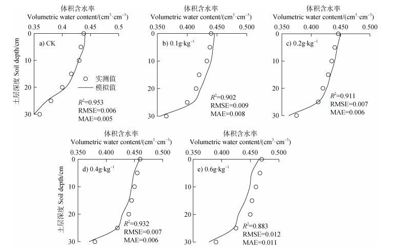 1.4 统计分析采用Excel进行各指标的计算和绘图,SPSS 22.0软件进行统计分析,对各处理的指标进行单因素方差分析,若存在差异(P < 0.05),则利用最小显著性差异法(LSD)进行多重比较,不同大写字母表示在α=0.05显著性水平上存在差异。采用决定系数(Determination coefficient,R2)、均方根误差(Root Mean Square Error,RMSE)、平均绝对值误差(Mean Absolute Error,MAE)等3个指标评价模型模拟的精度及可靠性。当R2越接近1表明模拟精度越高,RMSE和MAE越接近0表明实测值与模拟值越接近。通过计算变异系数(Coefficient of Variation,CV)评价CMC对土壤水力参数影响程度。