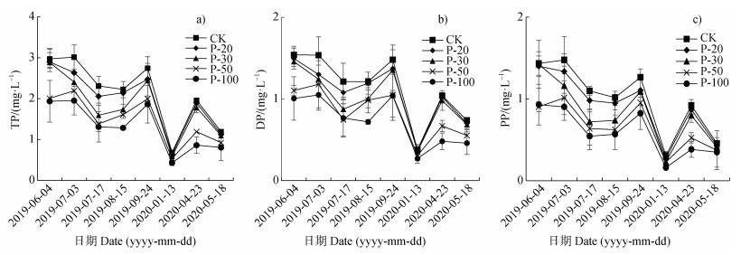 图 2 不同施磷处理下菜地径流浓度(a. 总磷(TP),b. 溶解态磷(DP)和c. 颗粒态磷(PP)) Fig. 2 Concentration of total P(TP, a), dissolved P(DP, b), and particulate P(PP, c)in vegetable fields under different phosphate fertilizer treatments |