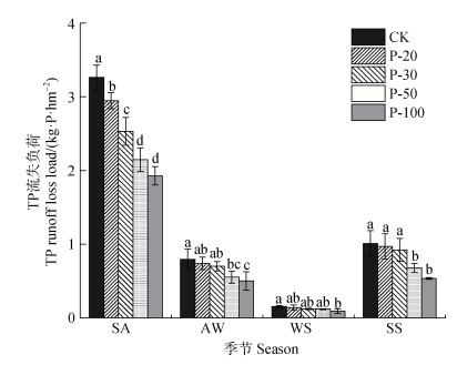 注:SA:夏秋季,AW:秋冬季,WS:冬春季,SS:春夏季。 Note: SA: Summer-autumn, AW: Autumn-winter, WS: Winter-spring, SS: Spring-summer. 图 3 不同施磷处理下菜地TP流失负荷季节性特征 Fig. 3 Seasonal characteristics of TP runoff loss load in vegetable fields under different phosphate fertilizer treatments |