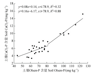 图 4 露天菜地土壤Olsen-P含量与CaCl2-P含量的关系 Fig. 4 Relationship between Olsen-P and CaCl2-P concentration in an open vegetable field |