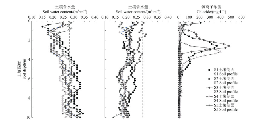 称取5 g烘干土样于50 mL离心管中,加入25 mL超纯水(18.25 MΩ·cm)置于恒温振荡机上振荡1 h,转速为180 r·min–1,随后用低速离心机离心15 min(4 000 r·min–1),取上清液过0.45μm滤头和RP活化柱以去除大分子有机物,利用IC离子色谱仪(Dionex,ICS-1100,美国)进行氯离子测定,随后转化成土壤水氯离子浓度。