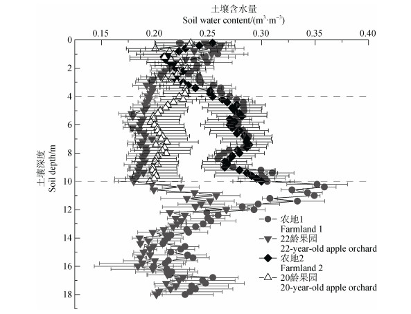 表 1 农地和20龄苹果园不同深度土层土壤水分含量 Table 1 Soil water content of different soil layers in farmlands and 20-year-old apple orchards/(m3·m–3) |