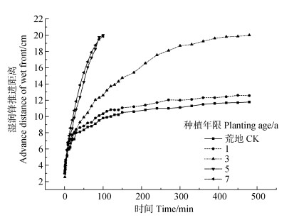 从图 3分析可知,CK的土壤湿润锋和种植1 a的土壤湿润锋推进速度较慢,200 min以后土壤湿润锋基本不再下移。种植3 a的土壤湿润锋500 min后基本达到20 cm的底部;种植5 a和7 a的土壤湿润锋在100 min左右即达到底部,且无明显差异。