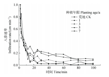 从图 4分析得知,0~15 min为初始入渗阶段,水分入渗锋面快速延伸,入渗速率递减。15 min以后入渗速率递减,逐渐趋于平稳。可以看出随着种植年限的增加,土壤入渗速率也是不断增加。