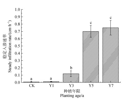 待土柱达到稳定入渗时测定其稳定入渗速率,从图 5分析可以发现,随着种植年限的增加,土壤稳定入渗速率也呈现增加趋势。其中,CK和种植1a的土壤稳定入渗速率较低,分别为0.007 cm·h–1和0.011 cm·h–1,且差异性不显著。种植3a的土壤的稳定入渗速率为0.12 cm·h–1,与其他种植年限土壤入渗速率差异显著。种植5a和7a的土壤的稳定入渗速率分别为0.69 cm·h–1和0.75 cm·h–1,且差异性不显著。种植7a的土壤稳定入渗速率较荒地提高了107倍。