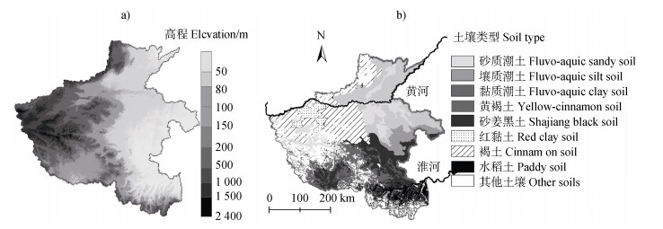 图 1 河南省高程(a)和土壤类型(b)分布图 Fig. 1 Elevation map(a)and soil type map(b)of Henan Province |