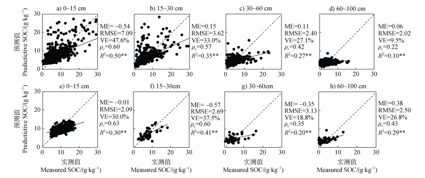 注:**表示相关系数在P < 0.01水平上显著 Note: **denotes that correlation coefficient is significant at the level of P < 0.01 图 3 土壤有机碳预测均值的精度检验(上:1982,下:2010) Fig. 3 The verification for predicted mean SOC(Upper: 1982, Below: 2010). |