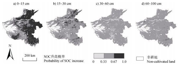 (6)计算每个网格点1 000次ΔSOC > 0的概率。参照Minasny等[34]的划分,以0~0.33、0.33~0.67、0.67~1.0三个概率区间分别代表明显降低、无明显变化和明显升高。