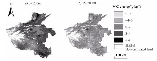 图 6 1982—2010年0~15 cm和15~30 cm层的SOC预测均值变化 Fig. 6 The predicted mean SOC changes in the layers of 0-15 cm and 15-30 cm over 1982-2010 |