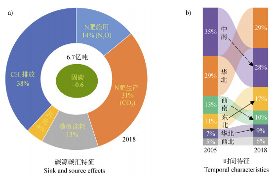 1 粮食生产碳排放的源汇效应和时空特征粮食生产具有碳源和碳汇效应的双重属性[10-11]。碳源效应主要表现在:(1)农作物田间种植过程的大量CH4和N2O排放;(2)农作物田间管理如灌溉、耕作等引起的能耗CO2排放;(3)氮肥、农药等农业生产资料加工、运输过程造成的CO2排放;(4)作物收获后秸秆焚烧引起的CH4和N2O排放[12-13]。碳汇效应主要表现在作物产量增加以及秸秆还田等管理措施引起的土壤有机碳库储量增加[14]。明确粮食生产过程碳排放的源汇效应对于识别热点排放环节,制定减排优先级具有指导意义。基于生命周期法和数据荟萃分析,Xia等[11]量化了我国三大主粮作物(水稻、小麦和玉米)从农业资料生产到籽粒收获过程碳排放的源汇效应。发现主粮生产碳排放具有“强碳源和弱碳汇”的特征(图 1a)。2018年,我国三大主粮作物生命周期生产过程的净碳排放量约为6.7亿吨CO2当量,占农业源总排放的比例高达56%,碳源效应极强。土壤固碳仅为0.6亿吨CO2当量,碳汇效应微弱。稻田CH4排放是碳源效应的最大贡献环节,占比38%;氮肥生产过程的能耗CO2排放贡献次之,占比31%;氮肥施用引起的N2O排放贡献占比14%,位列第三。因此,稻田CH4减排、氮肥优化管理以及土壤碳库提升是扭转粮食生产碳排放“强碳源和弱碳汇”效应,实现农业碳中和的优先着力点。