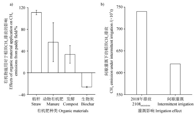 注:数据源自文献[11,23-24];b图中假设所有我国稻田均采用间歇灌溉。 Note: Relevant data is from previous studies [11, 23-24]. The intermittent irrigation is assumed to apply to all the paddy fields in figure b. 图 2 有机物料施用和间歇灌溉对我国稻田CH4排放的影响 Fig. 2 Effects of organic materials application and intermittent irrigation on CH4 emissions from paddy fields in China |