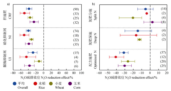 抑制土壤微生物的硝化和反硝化作用是农田土壤N2O减排的重点策略。硝化抑制剂,如双氰胺(DCD)、3,4-二甲基吡唑磷酸盐(DMPP)和2-氯- 6-三氯甲基吡啶(Nitrapyrin)等,能够降低土壤氨氧化菌活性,有效抑制NH4+-N向NO3–-N的转化过程,减少土壤N2O排放[47-50]。通过对大量田间试验结果进行分析,Xia等[51]发现硝化抑制剂能够平均降低我国三大主粮田间种植过程的N2O排放量40%,其中水稻减排51%,小麦减排32%,玉米减排39%(图 3a)。脲酶抑制剂,如氢醌(HQ)和如N-丁基硫代磷酰三胺(NBPT),通过抑制土壤脲酶活性来减缓尿素向NH4+-N转化,减少硝化作用底物,抑制N2O排放[51]。研究发现[51],脲酶抑制剂施用平均降低我国三大主粮田间种植过程的N2O排放量28%,其中水稻减排45%,小麦减排12%,玉米减排37%(图 3a)。硝化和脲酶抑制的配合施用能够更有效地降低粮食生产过程的N2O排放。除硝化和酶抑制剂以外,采取氮肥优化管理措施协调农作物需氮和土壤供氮关系,提高氮肥利用率,同样能够减少土壤N2O排放[52-53]。我国是世界上最大的肥料生产和消耗国,农田不合理的氮肥管理措施导致施入土壤中的化肥氮有很大一部分(通常高于50%)以N2O和其他活性氮(氨挥发、氮淋溶和径流)的形式进入大气或水体,造成环境污染[54-55]。即使考虑化肥氮在土壤中的长期残留效应,近年来我国氮肥的平均利用率也仅有43%,远低于欧美国家水平[55]。采取以“4R”为核心的氮肥优化管理措施,对于农业碳中和的实现和环境可持续发展具有重要意义。