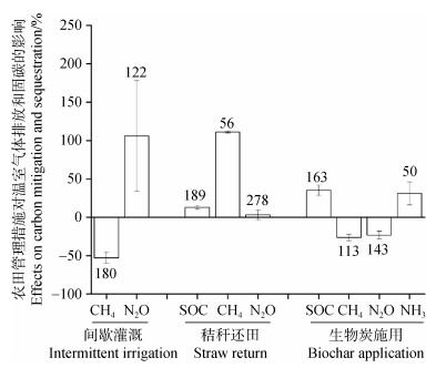 间歇灌溉是减少稻田CH4排放的有效措施,但同时会促进土壤N2O排放。Jiang等[32]发现间歇灌溉显著降低稻田CH4排放51%,同时增加N2O排放105%(图 4)。只考虑CH4和N2O的温室效应,Wang等[30]报道,与持续淹水相比较,无论秸秆还田与否、氮肥施用与否,间歇灌溉对稻田CH4的减排效应高于对N2O排放的促进效应,因此降低稻田碳排放的综合温室效应。然而,间歇灌溉在促进N2O排放的同时会加快土壤本底有机碳分解,减少土壤碳库储量。通过对大量田间试验结果进行分析,Shang等[63]报道间歇灌溉下稻田土壤碳库的损失效应和N2O排放的增加效应,高于CH4的减排效应,因此增加稻田的净温室效应。因此,在推广间歇灌溉的同时需要配套氮肥优化管理(如配方施肥)以及土壤固碳技术(如生物炭施用)等。