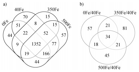 2 结果与讨论 2.1 缺铁和高铁胁迫差异蛋白质的筛选为了确定铁胁迫对水稻地上部蛋白水平的影响,将在1/2霍格兰营养液中生长7 d的水稻幼苗在缺铁、铁充足和2种浓度的高铁水培处理10 d后,取地上部组织分别提取总蛋白质。四种条件下共鉴定到高可信度蛋白质2 001个。其中,在缺铁处理、铁充足条件和2种浓度的高铁处理中分别鉴定到1 707、1 798、1 492和1 782个蛋白质,其中有1 352个(67.6%)蛋白质是四种条件下所共有的(图 1a)。与铁充足相比,从缺铁和两种浓度的高铁胁迫处理分别筛选出130、157和118个差异蛋白(图 1b)。其中,有34个蛋白质在3种胁迫中均有响应,分别有57、81和45个蛋白质仅出现在缺铁和两种浓度的高铁条件下。