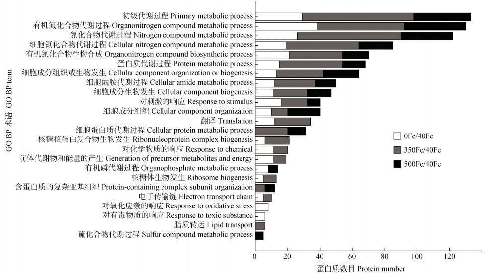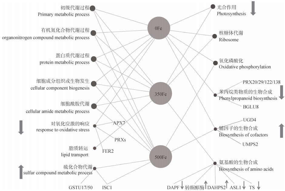 为比较水稻缺铁和高铁胁迫影响的生物学过程,本研究对来自缺铁和高铁胁迫的差异蛋白分别进行了GO生物学过程注释和富集分析。富集结果显示,缺铁和高铁胁迫的差异蛋白富集到了大致相同的生物学过程(图 2)。其中,富集到差异蛋白数量最多的术语是初级代谢过程、有机氮化合物代谢过程、蛋白质代谢过程、细胞成分组织或生物发生和细胞酰胺代谢。此外,对氧化应激的响应在缺铁胁迫特异性富集,而脂质转运和硫化合物代谢过程在高铁胁迫特异性富集。对氧化应激的响应是缺铁胁迫最显著富集的生物学过程,其中6个过氧化物酶(PRX29/20/122/125/138和APX7)、铁蛋白(Ferritin,FER2)和Os02g0612900的丰度在缺铁胁迫时均降低,这可能导致水稻地上部活性氧的积累和氧化损伤,从而抑制水稻的正常生长[13]。参与脂质转运过程和硫化合物代谢过程的差异蛋白丰度在高铁胁迫均增加,例如半胱氨酸脱硫酶(ISC1)和类谷胱甘肽S-转移酶(GSTU17、GSTU50)。谷胱甘肽-S-转移酶还是重要的是抗氧化酶,参与氧化应激产物的解毒[13]。