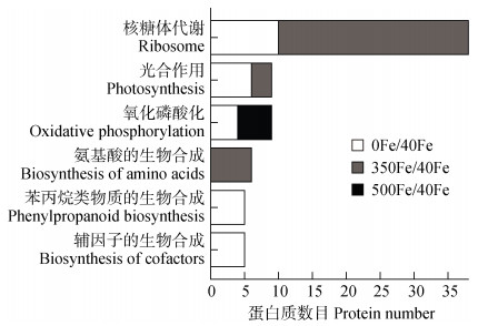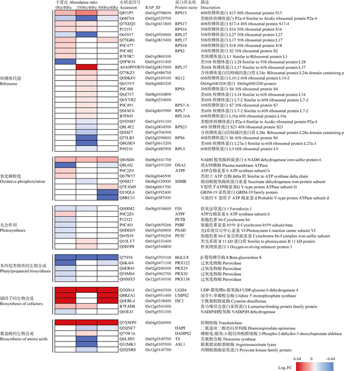 为了全面了解缺铁和高铁胁迫响应蛋白所涉及的代谢过程,本研究进一步对差异蛋白进行了KEGG富集分析。结果表明,缺铁和高铁胁迫中的差异蛋白均富集到核糖体、光合作用和氧化磷酸化代谢过程,而苯丙烷类物质的生物合成和辅因子的生物合成主要受缺铁胁迫的影响,氨基酸的生物合成主要受高铁胁迫的影响(图 3)。为了阐明参与上述代谢过程的蛋白质在缺铁和高铁胁迫下的调节模式,本文进一步标注了与这些代谢过程相关的差异蛋白在缺铁和高铁胁迫下的改变(图 4,图 5)。