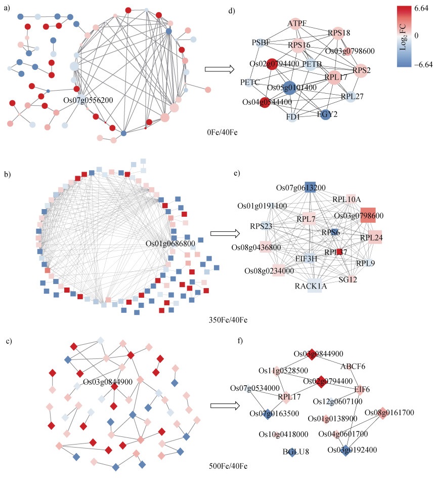 2.4 差异蛋白的互作网络分析和关键蛋白的筛选对差异蛋白的互作网络进行分析显示,在互作网络中,细胞色素b6-f复合铁硫亚基(cytochrome b6-f complex iron-sulfur subunit,Os07g0556200)、鸟嘌呤核苷酸结合蛋白亚基β样蛋白A(guanine nucleotide-binding protein subunit beta-like protein A,Os01g0686800)和Os03g0844900分别是缺铁和两种浓度的高铁差异蛋白中互作数目最多的蛋白质(图 6a,图 6b,图 6c)。基于互作网络,进一步使用Cytoscape中的cytoHubba插件,分别筛选出3种胁迫处理下的前15个枢纽蛋白作为后续研究的候选蛋白(图 6d,图 6e,图 6f)。其中,30S核糖体蛋白S16、Os03g0798600和RPL17分别是3个互作网络中得分最高的候选蛋白。缺铁胁迫筛选到的候选蛋白主要与光合作用(5个)和核糖体(7个)代谢过程有关;大部分的350 μmol·L–1高铁候选蛋白均为核糖体或推测的核糖体蛋白(12个);500 μmol·L–1高铁胁迫候选蛋白有3个与氧化磷酸化有关,包括V型质子ATP酶亚基G(Os04g0601700)、NADH脱氢酶铁硫蛋白6(Os08g0161700)和GRIM-19家族蛋白(Os03g0192400),此外,BGLU8与淀粉和蔗糖代谢有关,而RPL17是一个核糖体蛋白。这表明核糖体、光合作用和氧化磷酸化确实是水稻调控铁胁迫耐受性的关键途径。