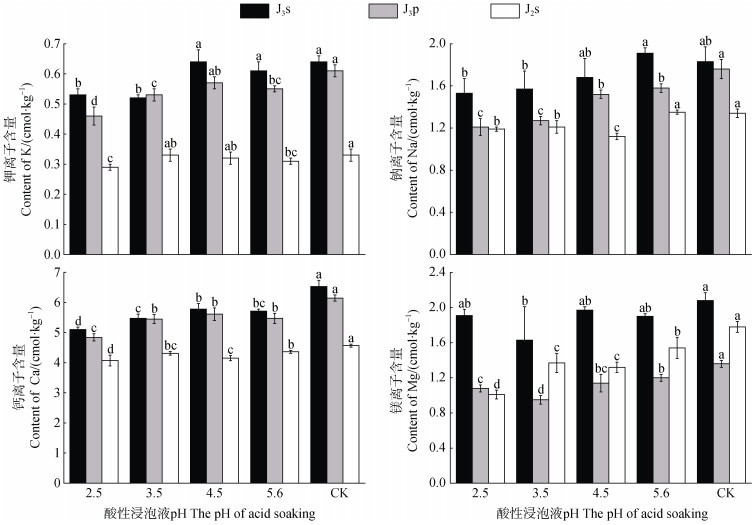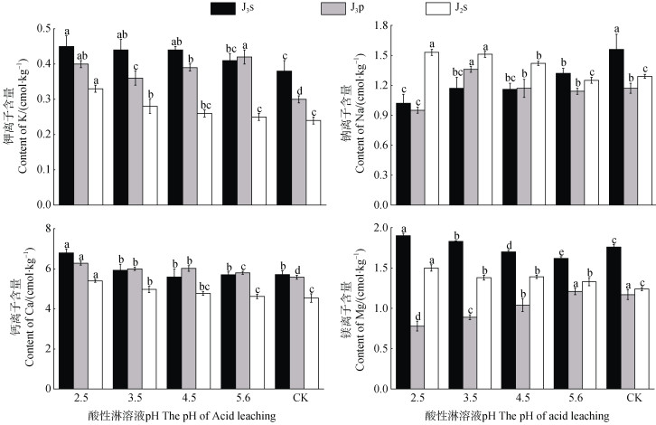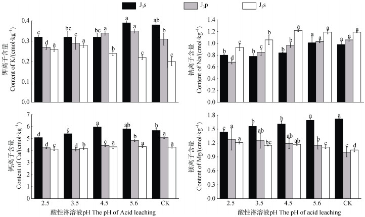 2 结果 2.1 酸化环境对风化产物盐基离子变化特征的影响通过对循环浸泡处理后的紫色母岩风化产物的交换性K+、Na+、Ca2+、Mg2+进行测定。结果表明,随着浸泡液酸度的增强,3组紫色母岩风化产物的交换性K+、Na+、Ca2+、Mg2+的含量均呈现下降趋势,而且不同pH酸溶液处理下的母岩风化产物中的交换性K+、Na+、Ca2+、Mg2+含量较CK处理均有不同程度的减少(图 1)。在pH 5.6~pH 2.5的酸溶液处理下,遂宁组(J3s)母岩风化产物的交换性K+、Na+、Ca2+、Mg2+含量分别较CK处理减少0.00%~17.19%、–4.37%~16.39%、11.49%~21.90%、5.29%~8.17%,蓬莱镇组(J3p)母岩风化产物交换性K+、Na+、Ca2+、Mg2+含量分别较CK处理减少5.65%~24.59%、10.23%~31.25%、8.78%~21.30%、11.76%~20.59%,沙溪庙组(J2s)母岩风化产物交换性K+、Na+、Ca2+、Mg2+含量分别较CK处理减少0.00%~12.12%、–0.75%~11.19%、4.6%~10.94%、13.48%~43.26%。此外,在相同酸度处理下,3组母岩风化产物的交换性K+、Na+、Ca2+含量的特征为遂宁组(J3s) > 蓬莱镇组(J3p) > 沙溪庙组(J2s),而交换性Mg2+含量表现为遂宁组(J3s) > 沙溪庙组(J2s) > 蓬莱镇组(J3p)。