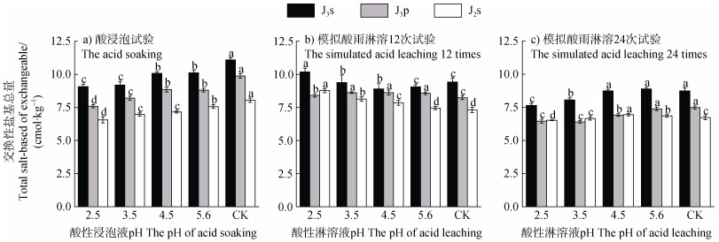 通过测定循环浸泡试验中3组紫色母岩风化产物的交换性盐基总量。结果表明,以CK处理为对照,3组紫色母岩风化产物的交换性盐基总量均随浸泡液pH的减小而减小(图 4a)。在pH5.6~pH2.5的酸溶液处理下,遂宁组(J3s)、蓬莱镇组(J3p)及沙溪庙组(J2s)紫色母岩风化产物的交换性盐基总量分别较CK处理减少8.75%~18.21%、10.83%~23.18%、5.85%~18.41%。此外,在相同酸浸泡处理下,交换性盐基总量的减小幅度由大到小的顺序为遂宁组(J3s) > 蓬莱镇组(J3p) > 沙溪庙组(J2s)。